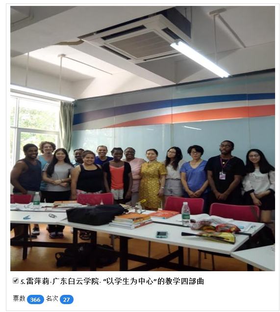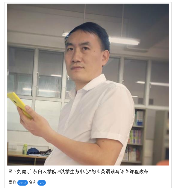 我校外国语学院教师刘毅、雷萍莉成功晋级西浦全国大学教学创新大赛大众评选阶段,单击名字前的小方框投票,请大家积极投出宝贵一票您的一次投票,您的一次转发,不仅是对刘毅、雷萍莉老师的支持,更是对广东白云学院的宣传!投票网址:http://innovation.v.vote8.cn/m