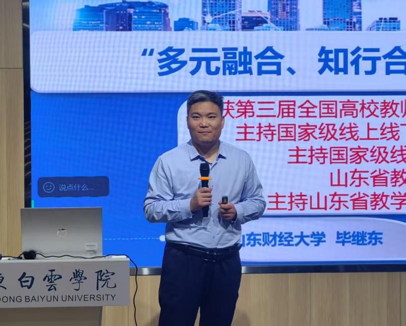 12月19日上午,教师发展中心联合教育技术中心在图书馆203学术报告厅举办了教学创新与创新能力专题培训讲座。本次讲座有幸邀请到第三届全国高校教师教学创新大赛新文科赛道一等奖获得者、山东财经大学毕继东教授作为主讲嘉宾,主题为:"多元融合,知行合一",教学创新设计与实践。讲座由教师发展中心主任贾琼主持,学校共有近50名教师参与了此次讲座。